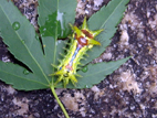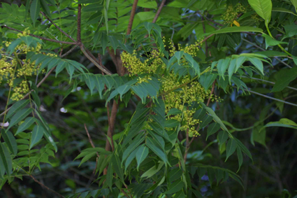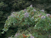山野に生える落葉樹です。枝先に集まった、細長い卵型のような葉が特徴で、秋になると紅葉します。ウルシオールを含み、全ての人が必ずかぶれるわけではありませんが、樹液に触れたり、時には雨の日に下を通ったりすると皮膚炎を起こすことがあります。皮膚が弱い方は、近くを通っただけでかぶれることもあります。帽子・長袖シャツ・手袋などを着用して肌の露出を避け、近づかないようにして下さい。 かぶれた際の応急処置は、患部を水洗いし、抗ヒスタミン剤含有のステロイド軟膏(注意1)を塗り、冷水や濡れタオルなどで冷やして下さい。ハゼノキの仲間に触れた手や、患部に触れた手で他の場所を触ると、かぶれが広がるので注意が必要です。かぶれがひどい場合は、かぶれた原因を確認し、皮膚科で治療を受けて下さい。 |