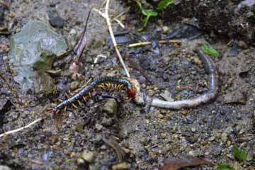 トビズムカデ トビズムカデ トビズムカデがヤマミミズを捕食 |