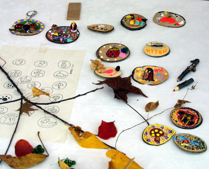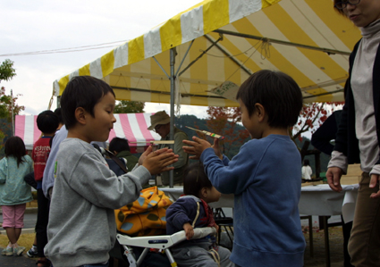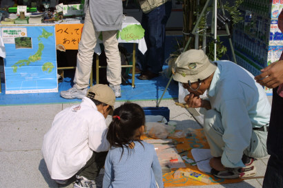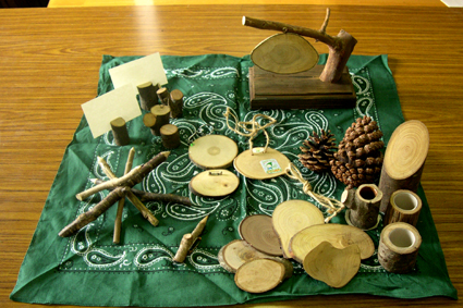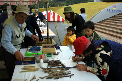 | 刃物を持つ時は真剣 竹とんぼだ! 高く飛んだよ!! 木の枝で楽しもう! 木の枝えんぴつで受付 どんぐり笛 マツボックリで作る置物 木の輪切りに描いた、子供たちの作品 石橋さんの作品いろいろ♪ |