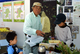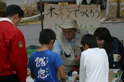 | 刃物を持つ時は真剣 竹とんぼだ! 高く飛んだよ!! 木の枝で楽しもう! 木の枝えんぴつで受付 どんぐり笛 マツボックリで作る置物 木の輪切りに描いた、子供たちの作品 石橋さんの作品いろいろ♪ |